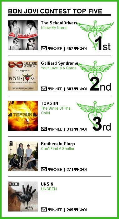 Από το Σάββατο οι SchoolDrivers βρίσκονται σταθερά μπροστά και ΠΡΩΤΟΙ στην ψηφοφορία για την ανάδειξη της μπάντας που θα ανοίξει τους BON JOVI στο ΟΑΚΑ αυτό το καλοκαίρι!