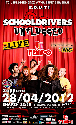 Σάββατο 28 Απριλίου 2012 – Ο πιο hot καλοκαιρινός προορισμός στα βόρεια προάστια, το Tempo Pool Bar στη Δροσιά, διασκεδάζει στο ρυθμό των Schooldrivers Unplugged! Οι Schooldrivers επιστρέφουν με μια special ακουστική εμφάνιση πέρα από κάθε προηγούμενο παρουσιάζοντας επιλεγμένα δικά τους κομμάτια και αγαπημένες 50’s rock’n’roll & 90’s rock διασκευές!