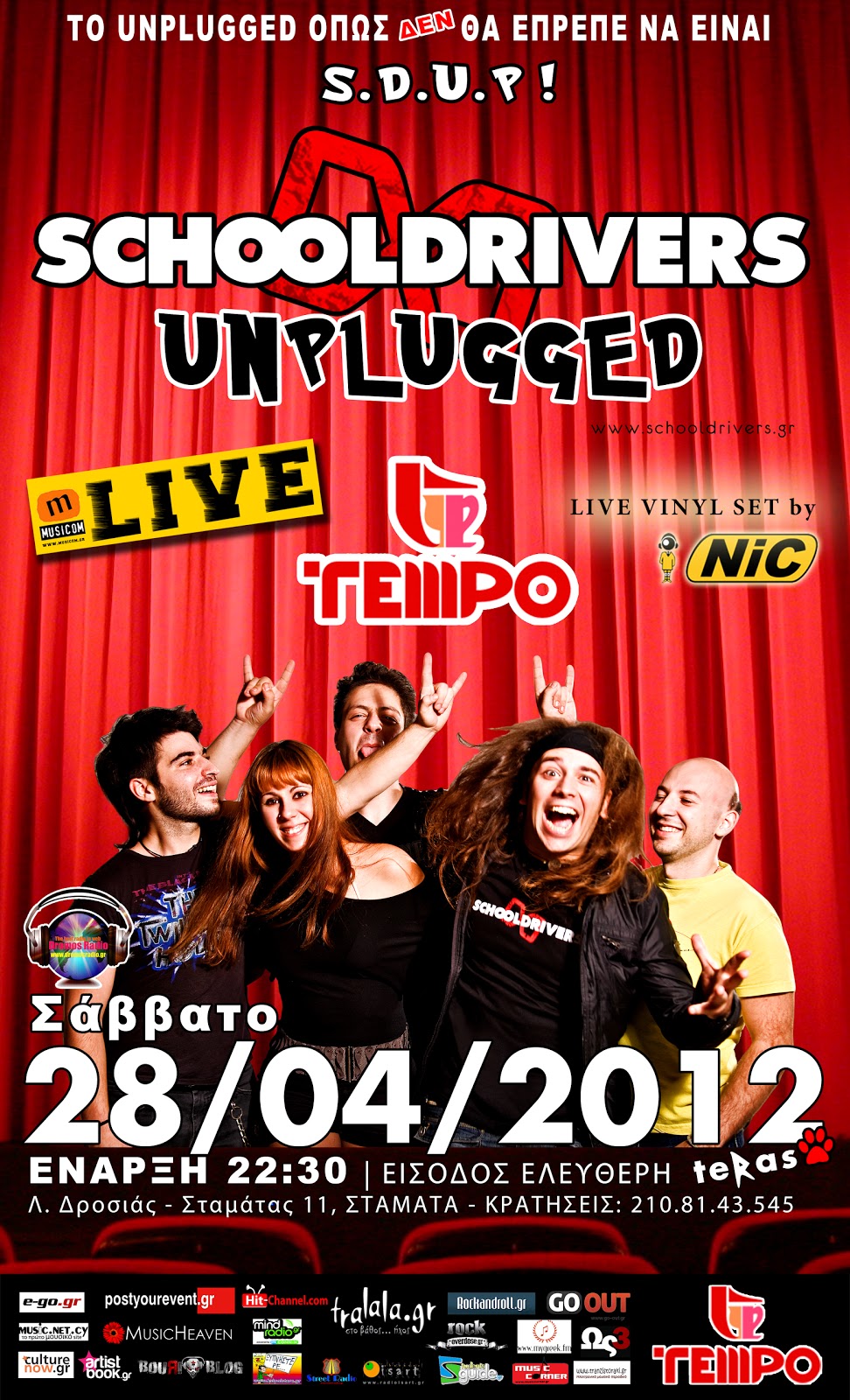 Σάββατο 28 Απριλίου 2012 – Ο πιο hot καλοκαιρινός προορισμός στα βόρεια προάστια, το Tempo Pool Bar στη Δροσιά, διασκεδάζει στο ρυθμό των Schooldrivers Unplugged! Οι Schooldrivers επιστρέφουν με μια special ακουστική εμφάνιση πέρα από κάθε προηγούμενο παρουσιάζοντας επιλεγμένα δικά τους κομμάτια και αγαπημένες 50’s rock’n’roll & 90’s rock διασκευές!